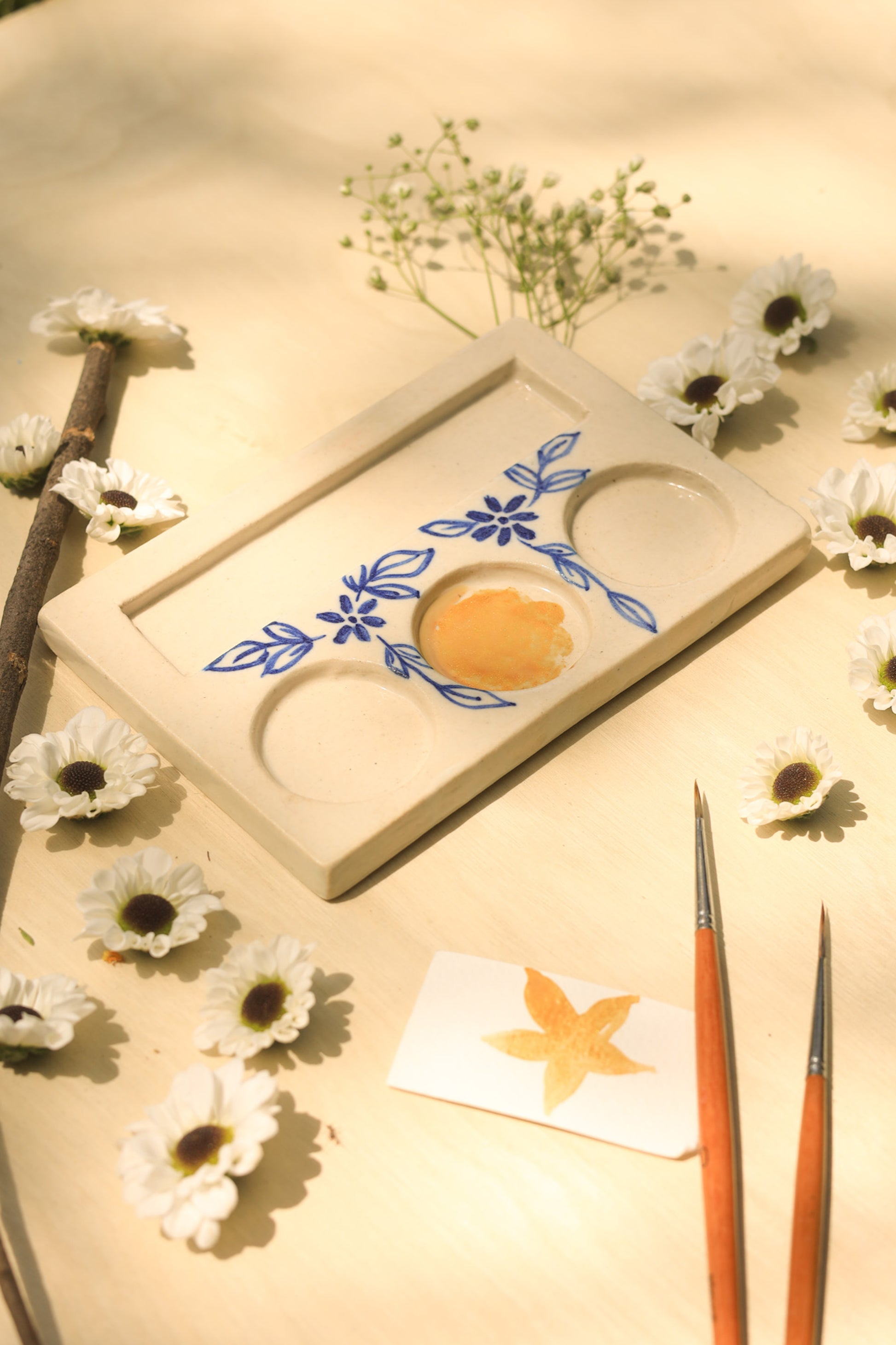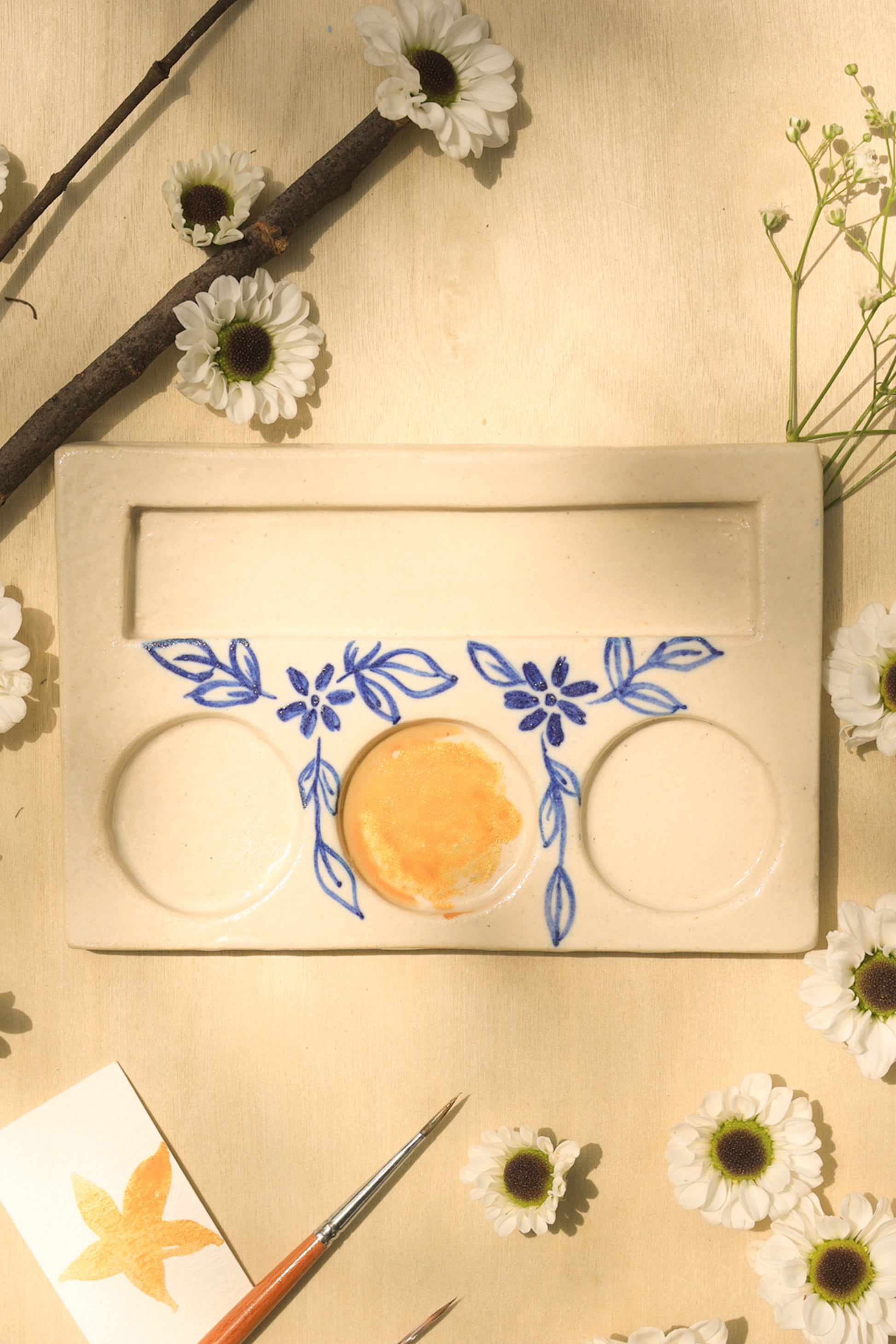 The ceramic palette is perfect for artists, professional painters, paint amateurs, art student and teachers, a great gift for your artist dost. Palette is made of eco-friendly stoneware clay, so it is very durable. Ideal for watercolour, gouache, acrylic, oil, tempera painting. These palettes are handcrafted and Hand painted by our artisans.