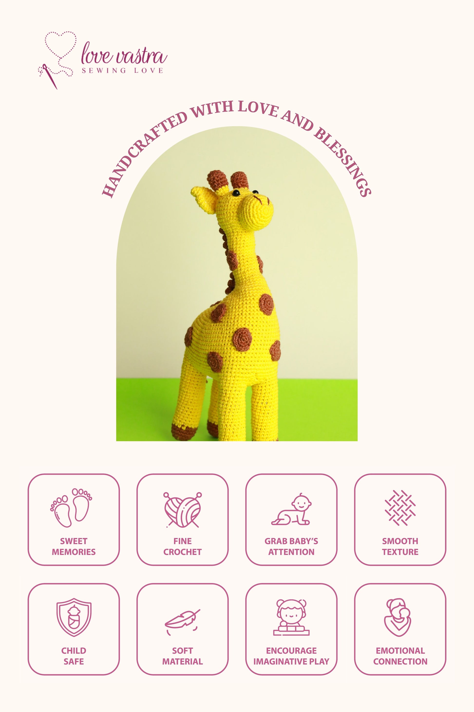 Adorable "Gigi the Giraffe" crochet toy, standing tall with its vibrant yellow and brown hues, this charming giraffe is sure to capture the hearts of children. Hand-made with high-quality, child-friendly materials, it's not just a toy but a cherished friend for endless adventures.