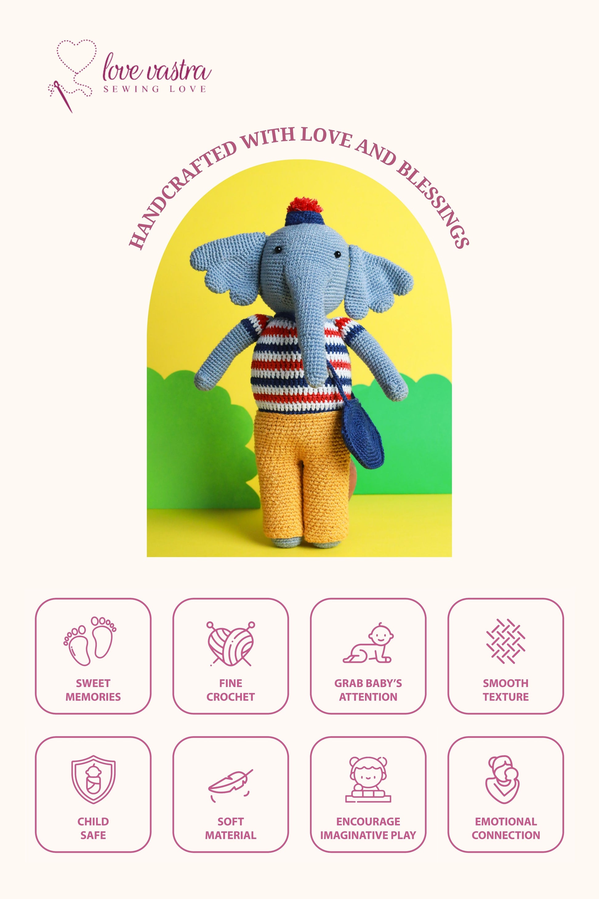 Introducing 'Jumbo buddy '- a fluffy and lovable elephant that will melt your little one's heart with its softness! Handcrafted by skilled artisans, this precious friend is personalized with intricate details, making it a truly special keepsake.
