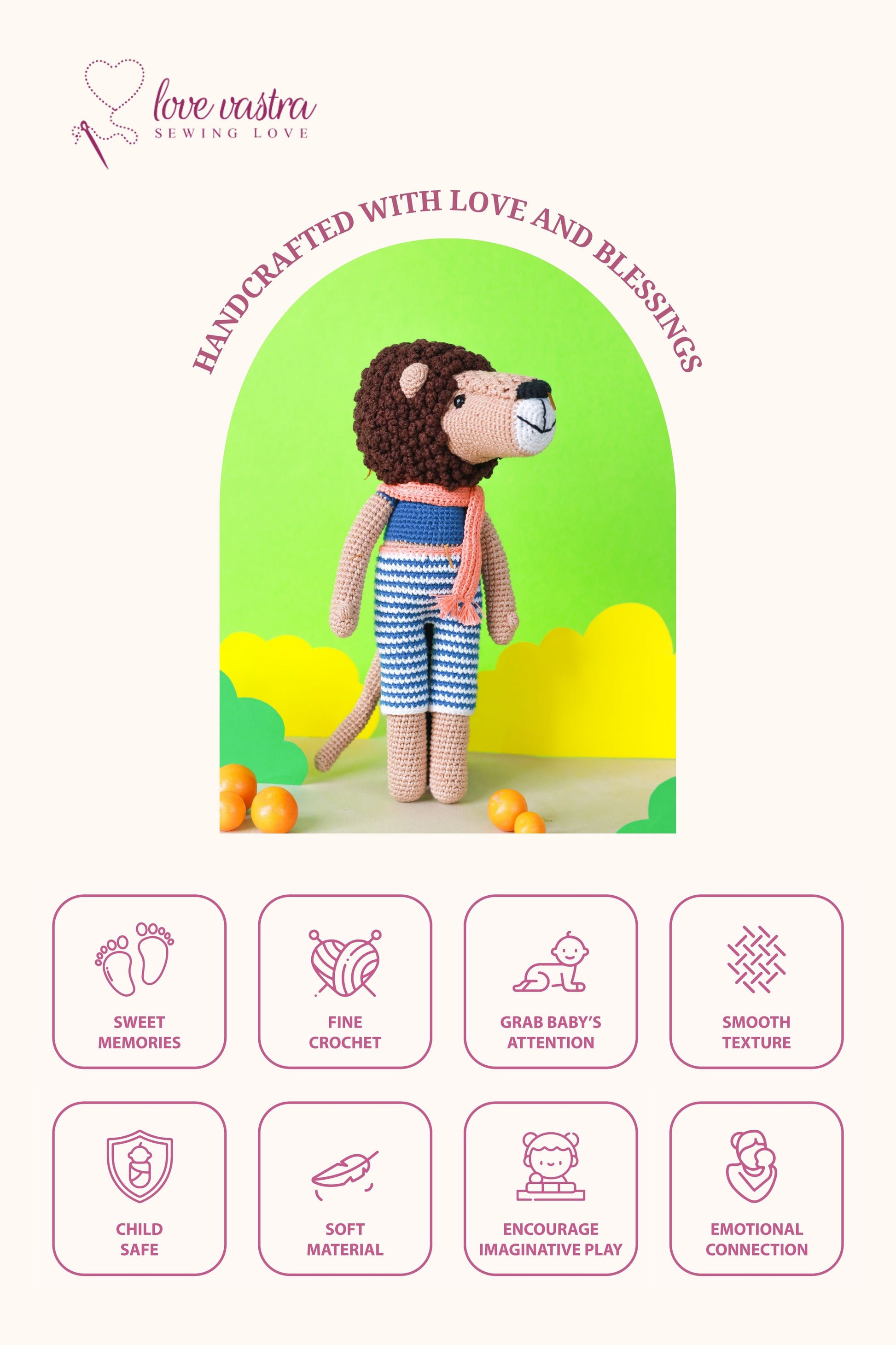 Roaring into the world of imagination with this adorable crochet lioness for little adventurers.