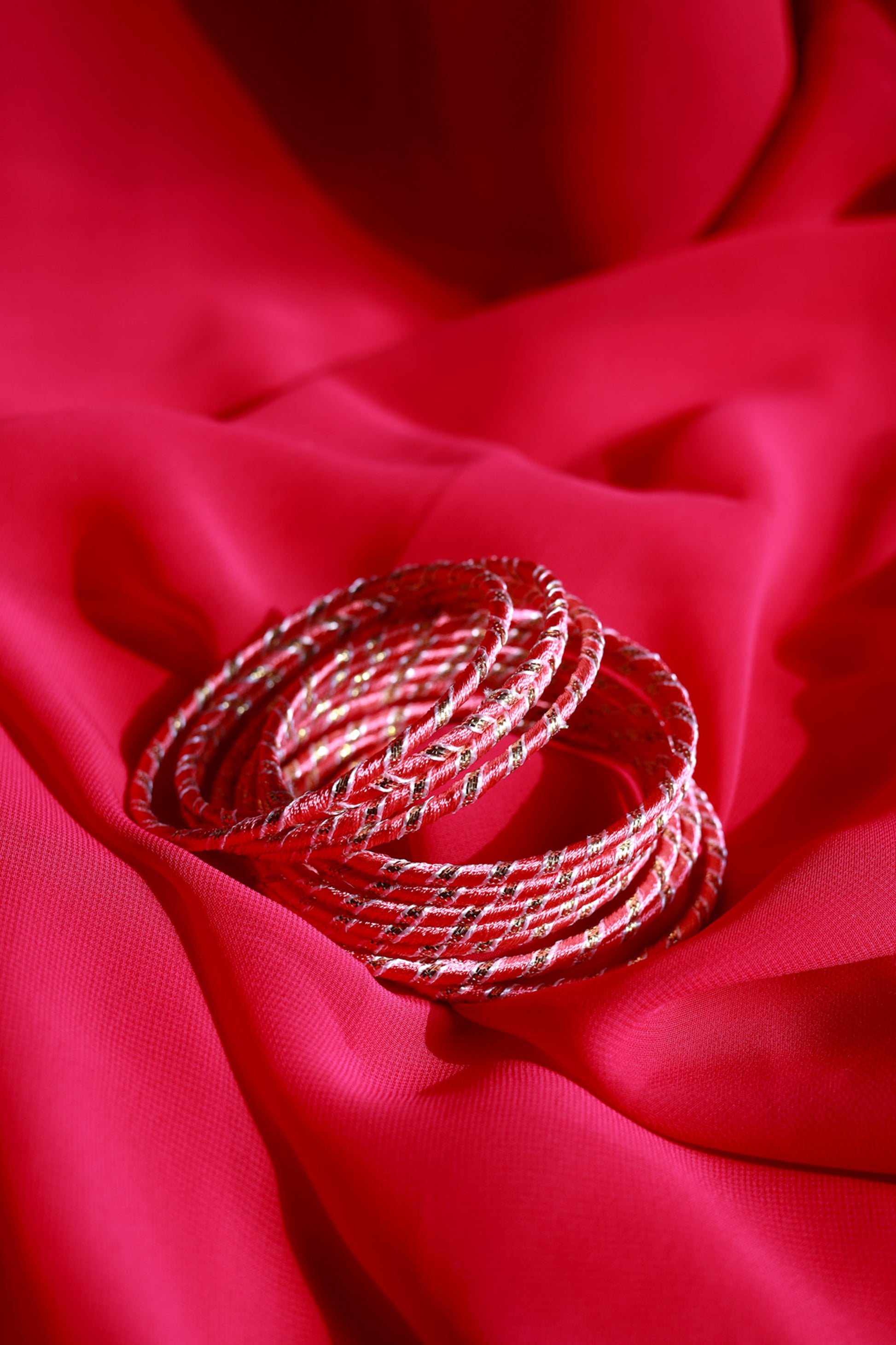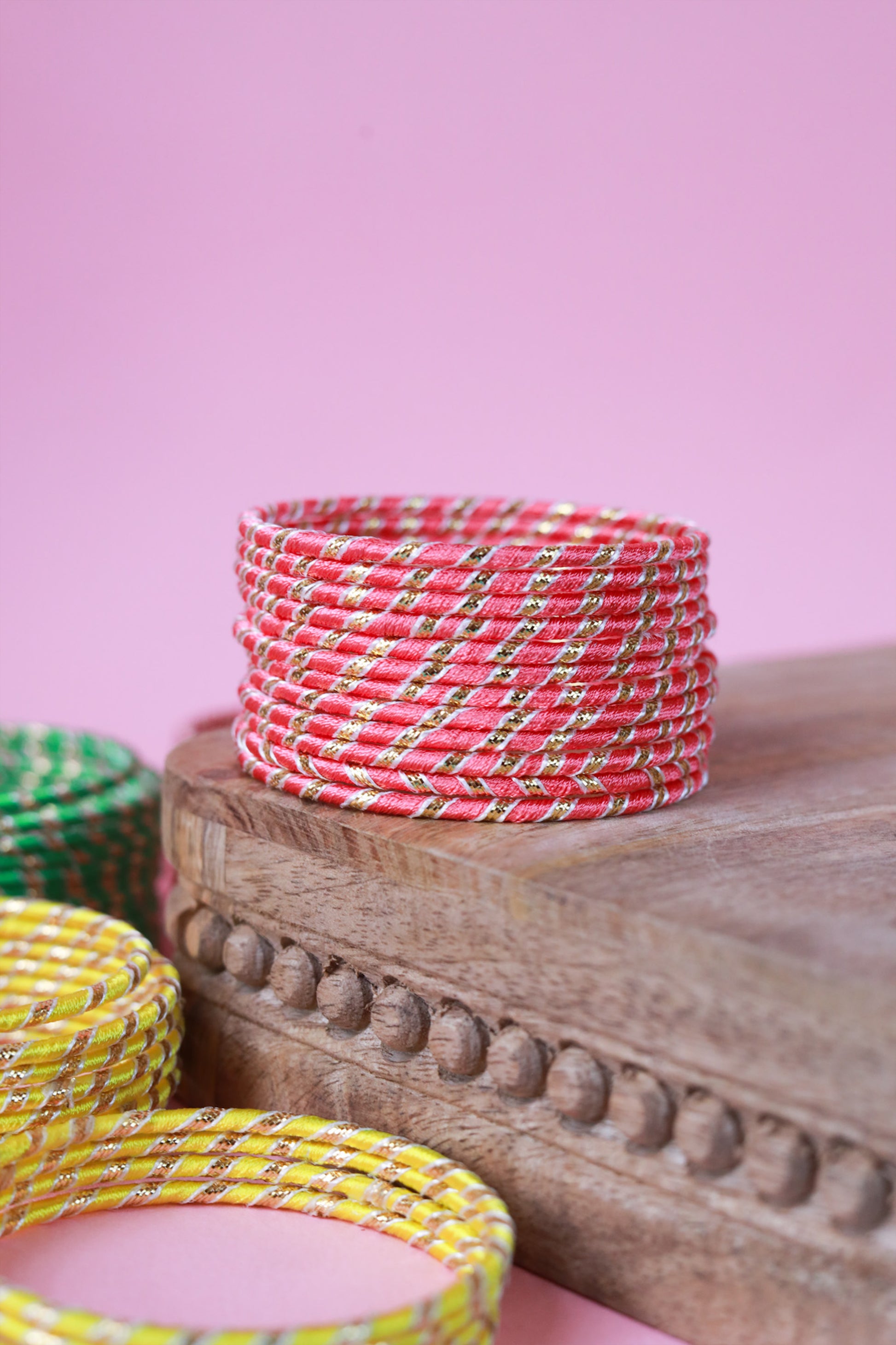 Celebrate the wedding season with these handcrafted bangles in bright colours made with silk thread and gotta. These bangles make for a unique gift and return gift option. Pair them with sarees, suits, lehengas and indo-western dresses to glam up the look.