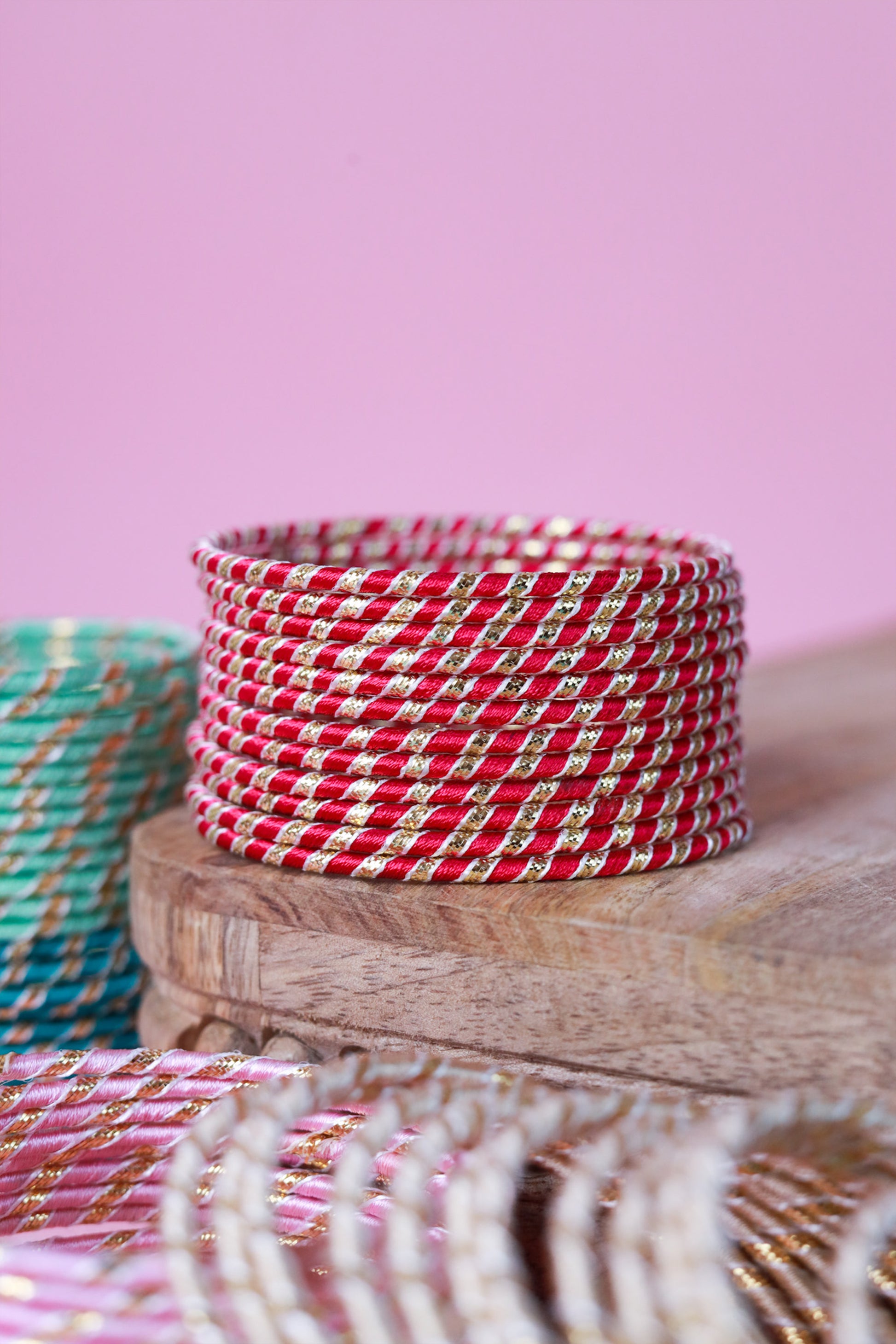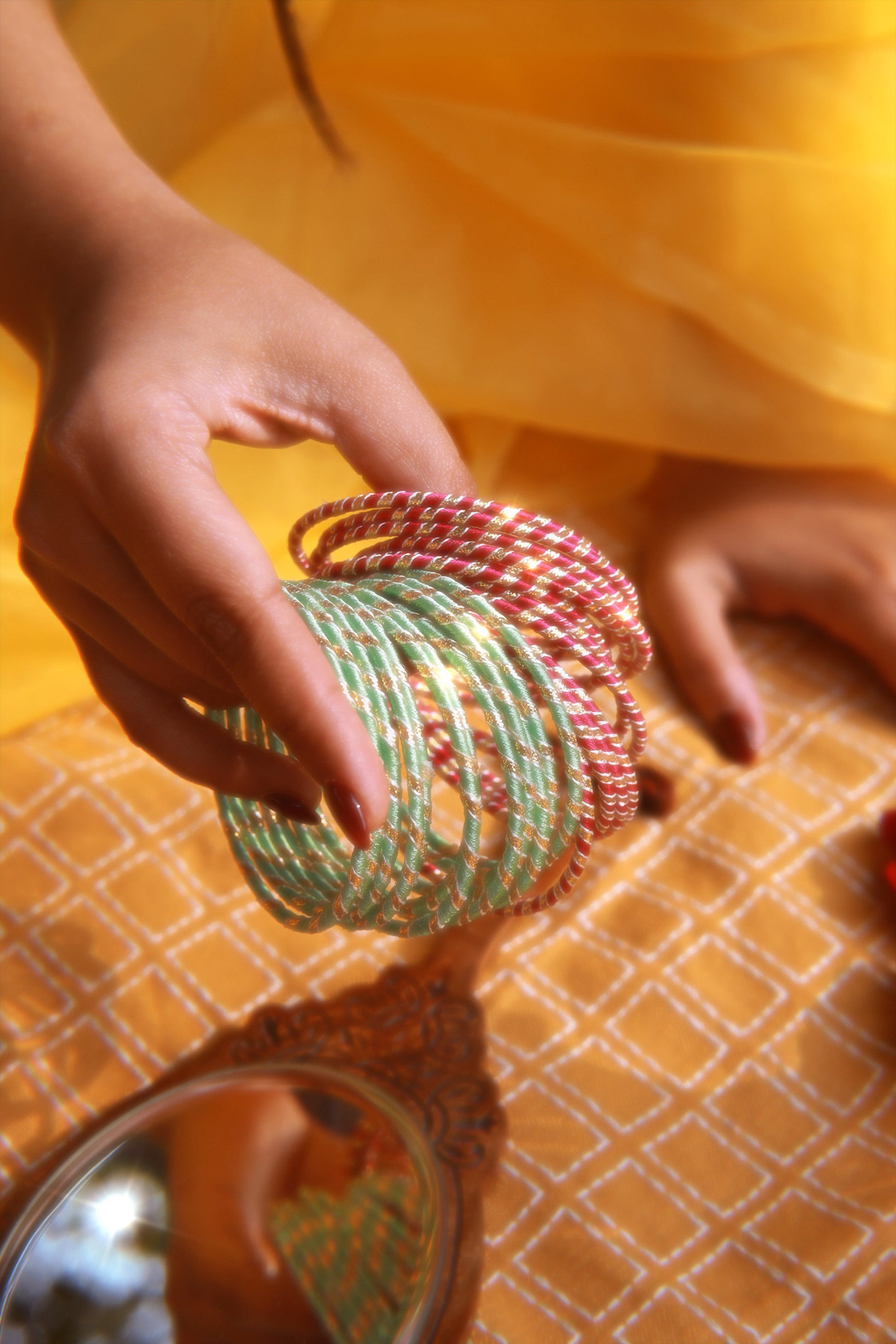 Celebrate the wedding season with these handcrafted bangles in bright colours made with silk thread and gotta. These bangles make for a unique gift and return gift option. Pair them with sarees, suits, lehengas and indo-western dresses to glam up the look.